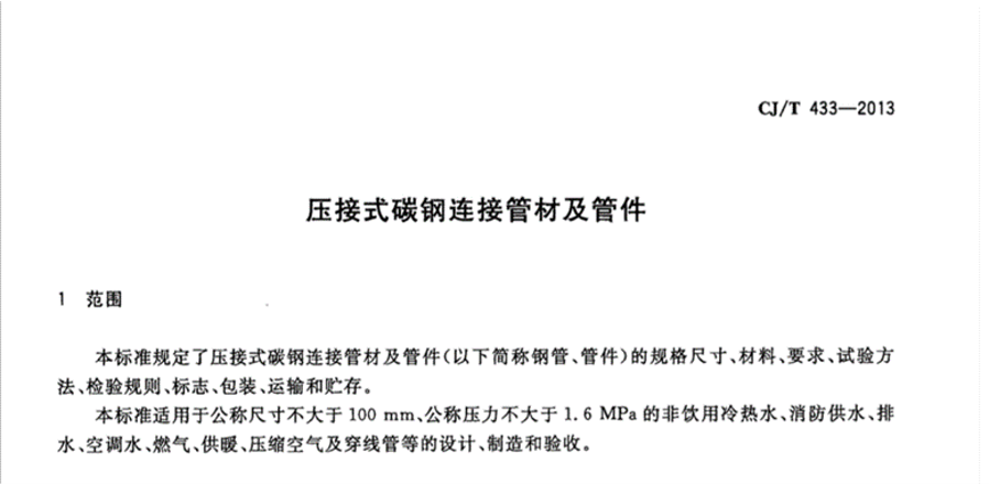 碳钢卡压连接可用于饮用冷热水、消防供水、排水、空调水、燃气、供暖、压缩空气及穿线管等的设计、制造和验收。